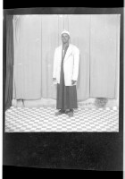 2893. EAP449/2/5/892 Reference (shelfmark): EAP449/2/5/892 Title: A man standing in the studio wearing a white jacket, black boubou, and white hat Collection Area: Endangered Archives Programme Languages: Not applicable Date Range: 2nd half od the 20th century Extent: 1 TIFF image