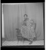 2896. EAP449/2/5/895 Reference (shelfmark): EAP449/2/5/895 Title: A woman standing in the studio with one foot on a chair and wearing a black and white dress Collection Area: Endangered Archives Programme Languages: Not applicable Date Range: 2nd half od the 20th century Extent: 1 TIFF image