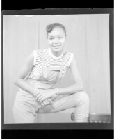 2905. EAP449/2/5/904 Reference (shelfmark): EAP449/2/5/904 Title: A young woman standing in the studio with one foot on a chair and wearing a striped t-shirt and overalls Collection Area: Endangered Archives Programme Languages: Not applicable Date Range: 2nd half od the 20th century Extent: 1 TIFF image