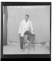 2948. EAP449/2/5/947 Reference (shelfmark): EAP449/2/5/947 Title: A man standing in the studio with one foot on a chair and wearing a printed shirt Collection Area: Endangered Archives Programme Languages: Not applicable Date Range: 2nd half od the 20th century Extent: 1 TIFF image