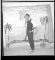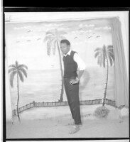 2982. EAP449/2/5/981 Reference (shelfmark): EAP449/2/5/981 Title: A man standing in front of a backdrop in the studio wearing a white shirt, black vest, black pants, and sandals (same man from Image 03801) Collection Area: Endangered Archives Programme Languages: Not applicable Date Range: 2nd half od the 20th century Extent: 1 TIFF image