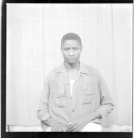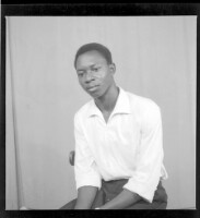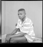2984. EAP449/2/5/983 Reference (shelfmark): EAP449/2/5/983 Title: A young man sitting in the studio wearing a black and white t-shirt and shorts Collection Area: Endangered Archives Programme Languages: Not applicable Date Range: 2nd half od the 20th century Extent: 1 TIFF image