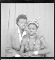 2987. EAP449/2/5/986 Reference (shelfmark): EAP449/2/5/986 Title: A young couple in the studio; the man wearing a suit and a black beret, the woman wearing a dress, earrings, and a necklace Collection Area: Endangered Archives Programme Languages: Not applicable Date Range: 2nd half od the 20th century Extent: 1 TIFF image