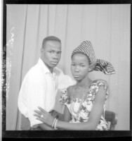 2988. EAP449/2/5/987 Reference (shelfmark): EAP449/2/5/987 Title: A young couple in the studio; the man wearing a suit and a black beret, the woman wearing a dress, earrings, and a necklace (same couple from Image 03807) Collection Area: Endangered Archives Programme Languages: Not applicable Date Range: 2nd half od the 20th century Extent: 1 TIFF image