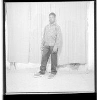 3144. EAP449/2/5/1143 Reference (shelfmark): EAP449/2/5/1143 Title: A man standing in the studio wearing a striped shirt and black pants Collection Area: Endangered Archives Programme Languages: Not applicable Date Range: 2nd half od the 20th century Extent: 1 TIFF image