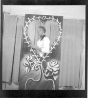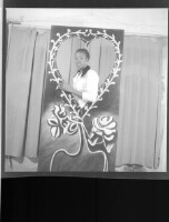3150. EAP449/2/5/1149 Reference (shelfmark): EAP449/2/5/1149 Title: A woman wearing a white shirt and earrings standing behind a frame in the shape of a heart. Collection Area: Endangered Archives Programme Languages: Not applicable Date Range: 2nd half od the 20th century Extent: 1 TIFF image
