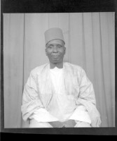 3170. EAP449/2/5/1169 Reference (shelfmark): EAP449/2/5/1169 Title: Full shot of a man sitting in front of a curtain wearing a large white boubou, a hat, and a ring in the studio. Collection Area: Endangered Archives Programme Languages: Not applicable Date Range: 2nd half od the 20th century Extent: 1 TIFF image