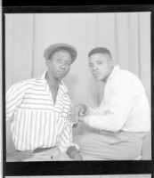 3309. EAP449/2/5/1308 Reference (shelfmark): EAP449/2/5/1308 Title: Two men sitting in the studio wearing striped shirts, one wearing a black hat Collection Area: Endangered Archives Programme Languages: Not applicable Date Range: 2nd half od the 20th century Extent: 1 TIFF image