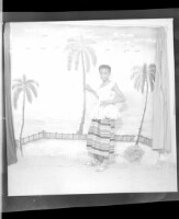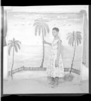 3413. EAP449/2/5/1412 Reference (shelfmark): EAP449/2/5/1412 Title: A young woman standing in front of the palm tree backdrop in the studio Collection Area: Endangered Archives Programme Languages: Not applicable Date Range: 2nd half od the 20th century Extent: 1 TIFF image