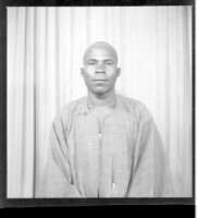 3588. EAP449/2/6/142 Reference (shelfmark): EAP449/2/6/142 Title: A man wearing a boubou, sitting facing forward in the studio. Collection Area: Endangered Archives Programme Languages: Not applicable Date Range: 2nd half od the 20th century Extent: 1 TIFF image