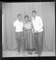 3615. EAP449/2/6/169 Reference (shelfmark): EAP449/2/6/169 Title: Two men wearing shirts and one woman wearing a skirt standing face-forward in the studio. Collection Area: Endangered Archives Programme Languages: Not applicable Date Range: 2nd half od the 20th century Extent: 1 TIFF image