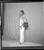 3723. EAP449/2/6/277 Reference (shelfmark): EAP449/2/6/277 Title: A woman with a bag standing in profile in the studio. Collection Area: Endangered Archives Programme Languages: Not applicable Date Range: 2nd half od the 20th century Extent: 1 TIFF image