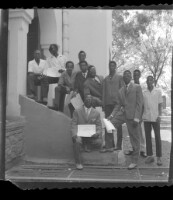 3726. EAP449/2/6/280 Reference (shelfmark): EAP449/2/6/280 Title: A photo of a group of 11 people, one sitting face-forward in front holding a poster and the rest behind. Collection Area: Endangered Archives Programme Languages: Not applicable Date Range: 2nd half od the 20th century Extent: 1 TIFF image
