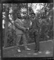 3728. EAP449/2/6/282 Reference (shelfmark): EAP449/2/6/282 Title: Two men wearing suits holding each others' hands in front of trees. Collection Area: Endangered Archives Programme Languages: Not applicable Date Range: 2nd half od the 20th century Extent: 1 TIFF image
