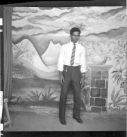 3741. EAP449/2/6/295 Reference (shelfmark): EAP449/2/6/295 Title: A man wearing a shirt and tie standing face-forward in the studio. Collection Area: Endangered Archives Programme Languages: Not applicable Date Range: 2nd half od the 20th century Extent: 1 TIFF image