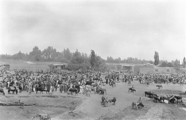 160. Neg 1083/44(156) Reference (shelfmark): Neg 1083/44(156) Title: Livestock market, Kashgar. Photographer: Bailey, Frederick Marshman Scope & Content: Genre: Urban Topographical Photography Collection Area: Visual Arts Languages: Not applicable Date Range: Jun 1918-Jul 1918 Extent: 1 item