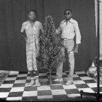 125. EAP054/1/140/259 Reference (shelfmark): EAP054/1/140/259 Title: Recreational photograph [c 1984] Scope & Content: Young couple standing either side of a plastic tree. Man in sunglasses Format of original: 59mm x 59mm plastic negative Collection Area: Endangered Archives Programme Languages: Not applicable Date Range: c 1984 Extent: 1 TIFF image