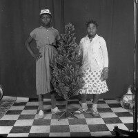 127. EAP054/1/140/263 Reference (shelfmark): EAP054/1/140/263 Title: Recreational photograph [c 1984] Scope & Content: 2 girls standing either side of plastic tree Format of original: 59mm x 59mm plastic negative Collection Area: Endangered Archives Programme Languages: Not applicable Date Range: c 1984 Extent: 1 TIFF image