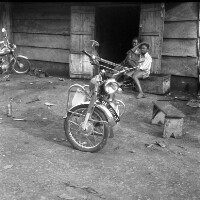 In a motorcycle garage in Bangang, 2 people sitting on a box, 2 motorbikes and a wooden bench, doors open in wooden wall behind. Format of original: 59mm x 59mm plastic negative