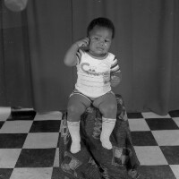 161. EAP054/1/140/368 Reference (shelfmark): EAP054/1/140/368 Title: Recreational photograph [c 1984] Scope & Content: Baby from Bamendjinda sitting on a stool, right hand by his ear. Format of original: 59mm x 59mm plastic negative Collection Area: Endangered Archives Programme Languages: Not applicable Date Range: c 1984 Extent: 1 TIFF image