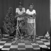167. EAP054/1/140/386 Reference (shelfmark): EAP054/1/140/386 Title: Recreational photograph [c 1984] Scope & Content: 2 young women from Bamesso standing, in matching outfits, iron grillwork in front. Format of original: 59mm x 59mm plastic negative Collection Area: Endangered Archives Programme Languages: Not applicable Date Range: c 1984 Extent: 1 TIFF image