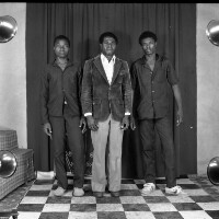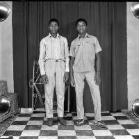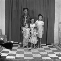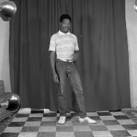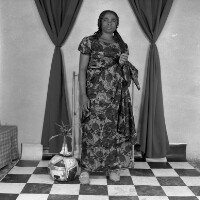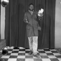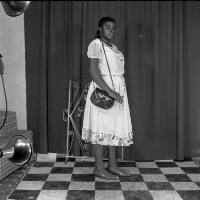 Photographer, as if leaving laboratory, photos in left hand, right hand stretched forward, in lab coat. Format of original: 59mm x 59mm plastic negative