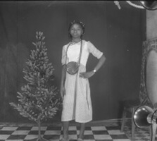 321. EAP054/1/163/388 Reference (shelfmark): EAP054/1/163/388 Title: Recreational photograph [c 1983] Scope & Content: Woman standing, hand on hips, by a plastic tree Format of original: 53mm x 59mm plastic negative Collection Area: Endangered Archives Programme Languages: Not applicable Date Range: c 1983 Extent: 1 TIFF image
