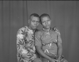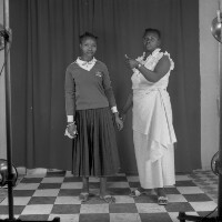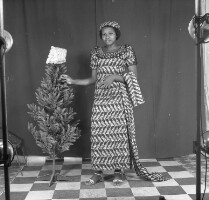 54. EAP054/1/140/399 Reference (shelfmark): EAP054/1/140/399 Title: Recreational photograph [c 1984] Scope & Content: Women from Mbouda standing, in "pagne" dress, right hand on plastic tree. Format of original: 57mm x 59mm plastic negative Collection Area: Endangered Archives Programme Languages: Not applicable Date Range: c 1984 Extent: 1 TIFF image