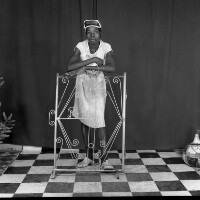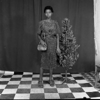 52. EAP054/1/140/383 Reference (shelfmark): EAP054/1/140/383 Title: Recreational photograph [c 1984] Scope & Content: Girl from Bameguyam standing, bag over right shoulder, dark dress, left hand on plastic tree. Format of original: 59mm x 59mm plastic negative Collection Area: Endangered Archives Programme Languages: Not applicable Date Range: c 1984 Extent: 1 TIFF image