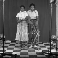 51. EAP054/1/140/382 Reference (shelfmark): EAP054/1/140/382 Title: Recreational photograph [c 1984] Scope & Content: Woman from Bangang standing, in white, giving thumbs up to younger woman standing next to her. Format of original: 59mm x 59mm plastic negative Collection Area: Endangered Archives Programme Languages: Not applicable Date Range: c 1984 Extent: 1 TIFF image