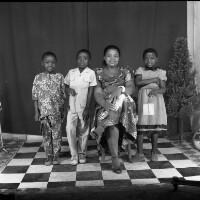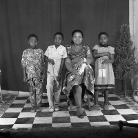56. EAP054/1/140/415 Reference (shelfmark): EAP054/1/140/415 Title: Recreational photograph [c 1984] Scope & Content: Madame Dontsi sitting, legs crossed, with her children, on National Youth Day, 11 February. Format of original: 59mm x 59mm plastic negative Collection Area: Endangered Archives Programme Languages: Not applicable Date Range: c 1984 Extent: 1 TIFF image