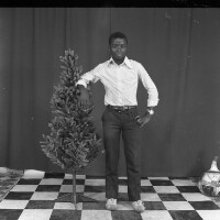 87. EAP054/1/140/120 Reference (shelfmark): EAP054/1/140/120 Title: Recreational photograph [c 1984] Scope & Content: Man standing, hand on hip, other hand touching plastic tree Format of original: 59mm x 59mm plastic negative Collection Area: Endangered Archives Programme Languages: Not applicable Date Range: c 1984 Extent: 1 TIFF image