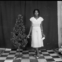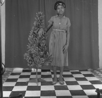 82. EAP054/1/140/93 Reference (shelfmark): EAP054/1/140/93 Title: Recreational photograph [c 1984] Scope & Content: Girl standing, touching a plastic tree Format of original: 57mm x 59mm plastic negative Collection Area: Endangered Archives Programme Languages: Not applicable Date Range: c 1984 Extent: 1 TIFF image