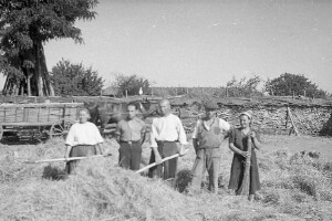 Threshing-floor, unknown area; 1946-1952; taken by an unknown photographer; 1946-1952, black-and-white negative, dirty, scratchy, good quality; 24x36 mm; Inventory iBulgarian language
