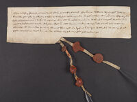 - Will of Katherine de Bassi of Tournai, wife of the late Baldwin du Bas, making arrangements for paying her debts, her burial, and her goods. Includes payments to parish priests, hostels, hospitals, the sick, her relatives and those of her husband; dated 1 May 1360. Endorsed: in a late 14th-cent...