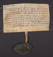 - Acknowledgement by Guy [de Dampierre, d. 1305], count of Flanders and marquis of Namur, and Isabeau [of Luxembourg, 1247-98], his wife, countess of Namur, of a debt to their clerk Raoul de Harcout of 150 gros livres tournois; dated 1294. The recto also features a summary of the charter's content...