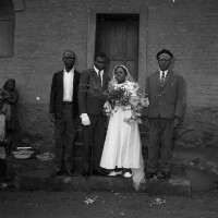 109. EAP054/1/108/109 Reference (shelfmark): EAP054/1/108/109 Title: Recreational photograph [c 1970-c 1995] Scope & Content: Bridal couple, groom in white gloves, between 2 men, building behind. Format of original: 59mm x 59mm plastic negative Collection Area: Endangered Archives Programme Languages: Not applicable Date Range: c 1970-c 1995 Extent: 1 TIFF image