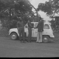 114. EAP054/1/108/114 Reference (shelfmark): EAP054/1/108/114 Title: Recreational photograph [c 1970-c 1995] Scope & Content: Photographer Monsieur Jacques Toussele greeting Moise and Simon by a road, car behind. Format of original: 59mm x 59mm plastic negative Collection Area: Endangered Archives Programme Languages: Not applicable Date Range: c 1970-c 1995 Extent: 1 TIFF image