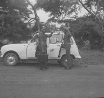 115. EAP054/1/108/115 Reference (shelfmark): EAP054/1/108/115 Title: Recreational photograph [c 1970-c 1995] Scope & Content: Moise on the right and Simon on the left, by a road, in front of photographer Mr Jacques' car. Format of original: 56mm x 59mm plastic negative Collection Area: Endangered Archives Programme Languages: Not applicable Date Range: c 1970-c 1995 Extent: 1 TIFF image