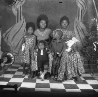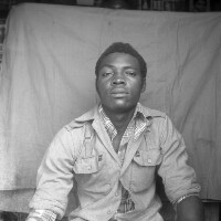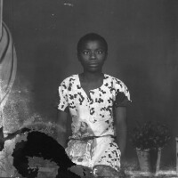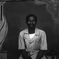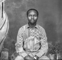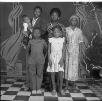 Man from Bafounda standing, in dark trousers and pale shirt, between 2 wives, one in pale outfit and headscarf, the other in white skirt and darker top. Format of original: 59mm x 59mm plastic negative