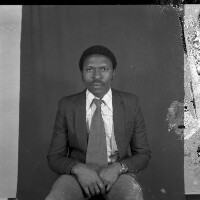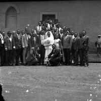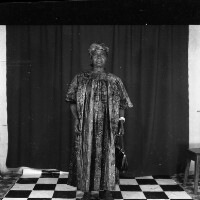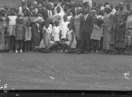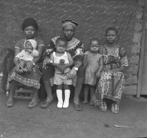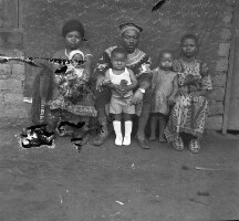 Village chief in traditional dress, holding cow horn used as a glass, 2 elders on his right, one of his wives on his left, fibre bag over her shoulder, gourd in front, all standing. Format of original: 59mm x 59mm plastic negative