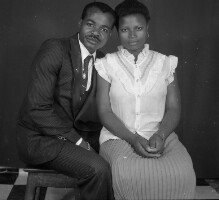 Girl with little brother, she is wearing a dress, right hand on the boys head, left hand on hip, the boy with right hand in his shorts pocket. Format of original: 59mm x 59mm plastic negative