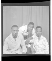 161. EAP449/2/14/161 Reference (shelfmark): EAP449/2/14/161 Title: A man wearing a shirt bending over in profile in between two other men wearing shirts and sitting face-forward in the studio. Collection Area: Endangered Archives Programme Languages: Not applicable Date Range: 2nd half od the 20th century Extent: 1 TIFF image