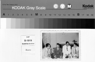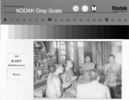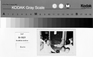 Novice's ordination at Vat Saen Sukharam in 1993, which has Sathou Nyai Khamchan Virachitta Mahathera, Abbot of Vat Saen Sukharam is a preceptor. Sathou Nyai Khamchan gives a sermon on ordination. Original material consists of: chromogenic print