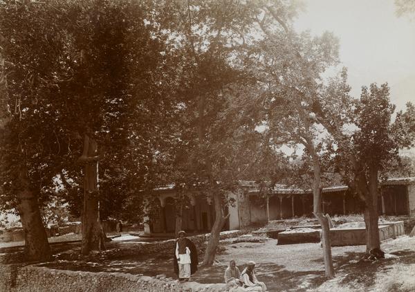 Genre: Portrait Photography PUBLISHED: 'Ruins of Desert Cathay', vol 1, fig. 18: 'Bahadur khan, Governor of Mastuj, seated in centre with his two sons; Khan Sahib Pir Bakhsh on his right, and Mastuji attendants'. 'At the bridge leading back to the left bank old Bahadur Khan, the actual ruler o...