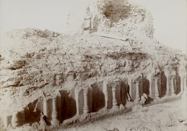 Genre: Architectural Photography PUBLISHED: 'Ruins of Desert Cathay', vol. 1, pl. 140: 'Remains of colossal figures of seated Buddhas in north-east passage of ruined shrine M. II., Miran site.' 'Serindia', I, fig. 124, 'Remains of colossal stucco images of seated Buddhas iv-vi, excavated in N.E...