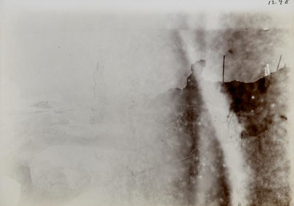Genre: Architectural Photography PUBLISHED: 'Serindia', I, fig. 123, 'Remains of colossal stucco images of seated Buddhas i-iv excavated in N.E. passage of ruined shrine M. II, Miran site.' Subjects = archaeological expeditions; archaeological sites; Buddha images; exploration; Stein Collecti...
