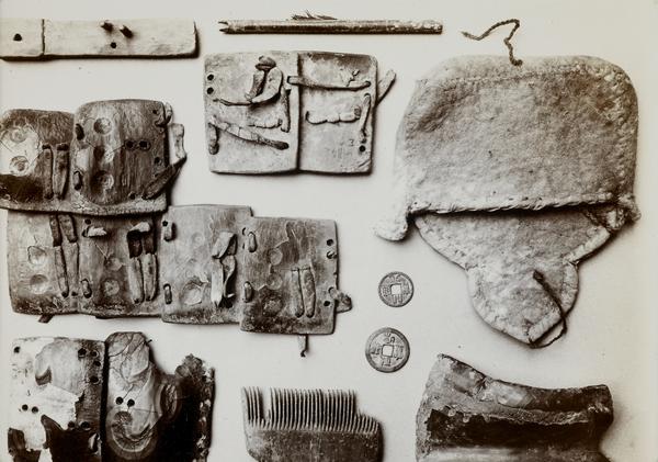 PUBLISHED: 'Ruins of Desert Cathay', vol. 1, pl. 138: 'Remains of scale armour and miscellaneous objects found in Tibetan fort, Miran. Scale, two-sevenths [in published version]. 24, 26, a, b, c. Scales of lacquered leather from suits of armour, the last two showing method of lacing outside and ...
