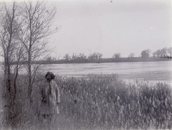 Genre: Landscape Photography Poor quality print. General view of ruin from west, with Roze Beg standing among the foundations: 'Badly decayed wall fragments of a second small structure in hard-burnt bricks, half-hidden below a tamarisk-cone, were traced not far from the one described in Serindi...