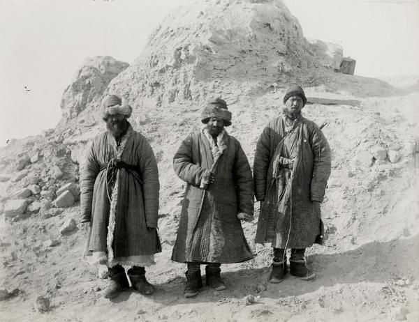 Genre: Portrait Photography Full-length portrait of the three men standing in front of stupa remains at Miran. PUBLISHED: ' Innermost Asia', vol. 1, fig. 121: 'Sher Ali Khan, Bajauri trader, with two travel companions.' Sher Ali Khan's arrival at Miran was fortunate: Stein had just received ne...